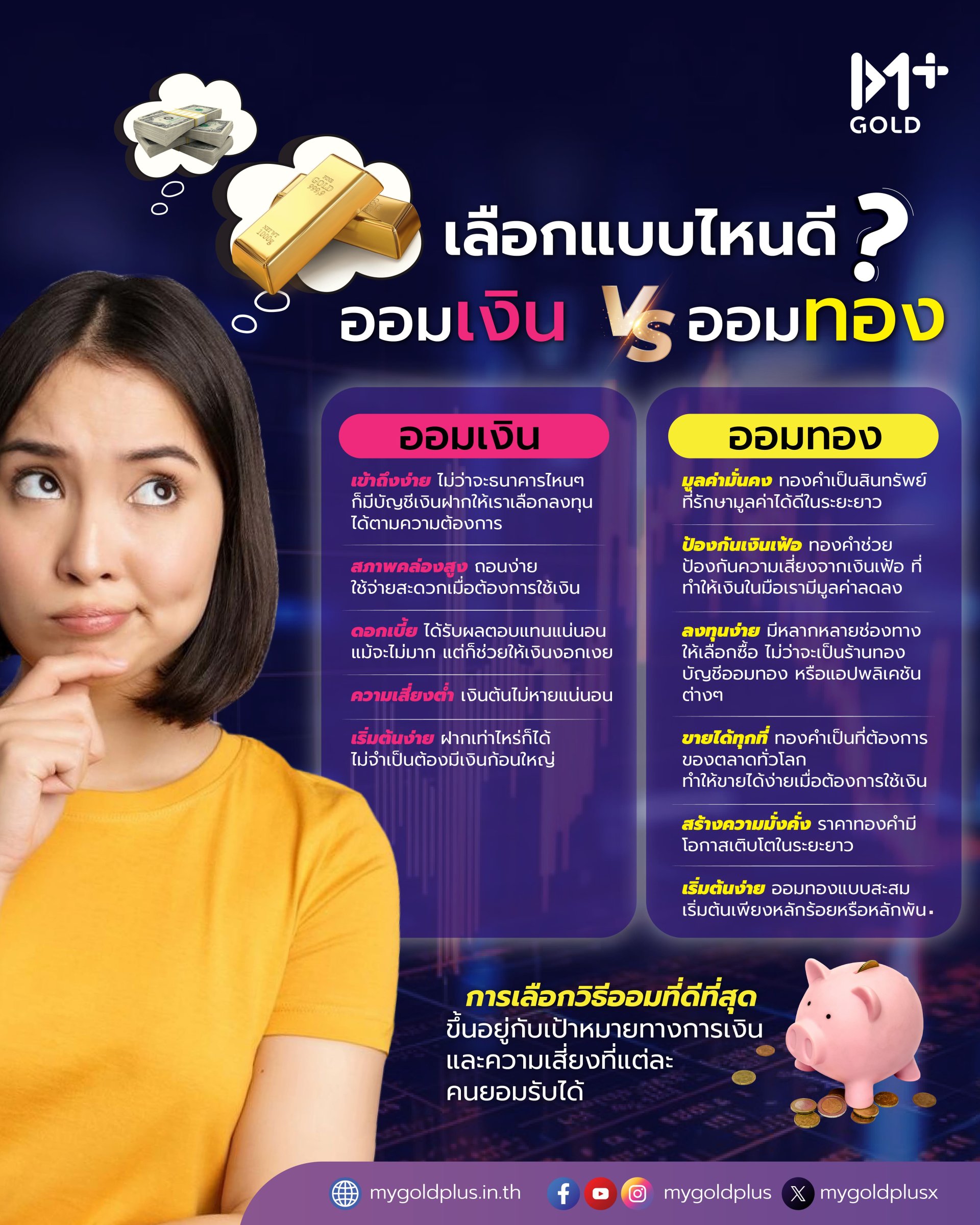 การตัดสินใจเลือกระหว่าง "ออมเงิน" หรือ "ออมทอง" นั้น ขึ้นอยู่กับเป้าหมายทางการเงิน ระยะเวลาในการลงทุน และระดับความเสี่ยงที่ยอมรับได้ หากต้องการความเสี่ยงต่ำ สภาพคล่องสูง และผลตอบแทนที่แน่นอน การออมเงินผ่านบัญชีเงินฝากธนาคารอาจเป็นทางเลือกที่เหมาะสม แต่หากต้องการป้องกันความเสี่ยงจากเงินเฟ้อ และมีโอกาสได้รับผลตอบแทนที่สูงขึ้นในระยะยาว การออมทองอาจเป็นทางเลือกที่น่าสนใจ การกระจายความเสี่ยงโดยการออมทั้งสองแบบควบคู่กัน ก็เป็นอีกกลยุทธ์ที่สามารถพิจารณาได้